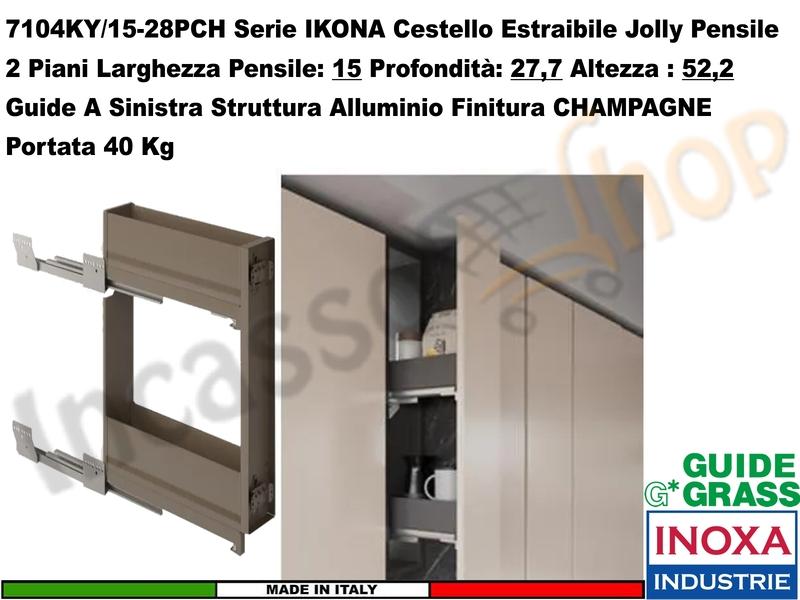 | Installazione | Fissaggio Carello estraibile su Pensile Jolly da cm. 15 ad anta frontale mediante staffe regolabili. |
