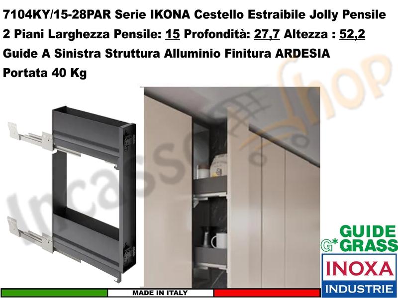 | Installazione | Fissaggio Carello estraibile su Pensile Jolly da cm. 15 ad anta frontale mediante staffe regolabili. |
